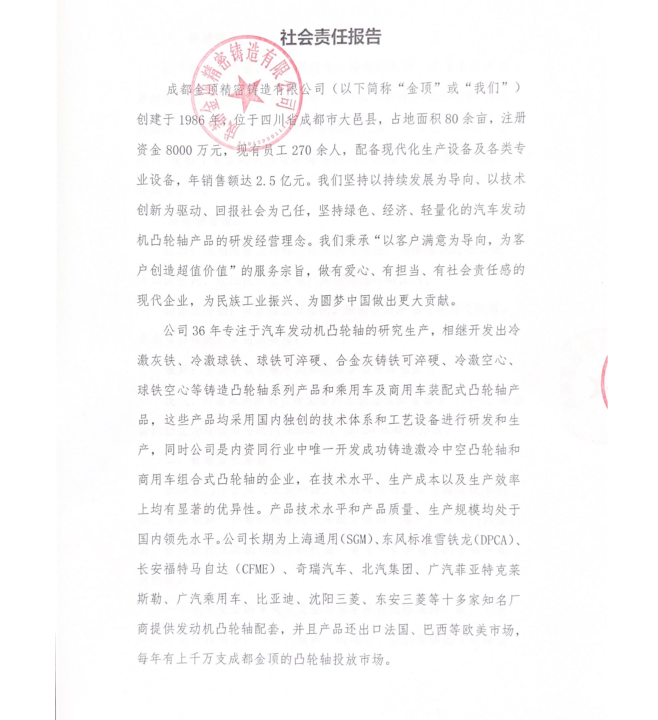 成都金頂精密鑄造有限公司是一家專業的制造型的企業。公司位于成都大邑經濟開發區,投資金額1.6億元,占地面積80畝;為SGM、PSA、MAZDA、奇瑞汽車、廣汽集團、吉利汽車、北汽集團等國內主流汽車企業進行配套,并通過客戶全球采購平臺銷往歐洲、北美市場。